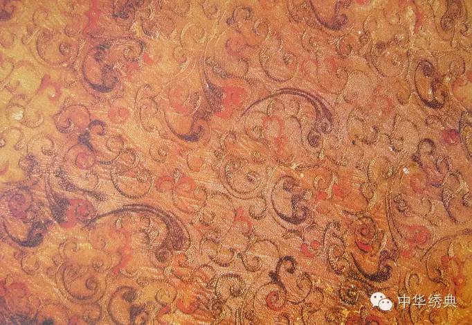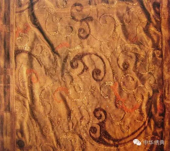 黑色羅地信期繡殘片,西漢,1972年湖南省長沙馬王堆一號墓出土,紋長9.5CM,紋寬7.5CM,湖南省博物館藏。黑色地相對較少,但也是秦漢時期的流行色,此殘片用辮子針繡,施以草綠、磚紅、橙等色,絢麗典雅而不失高貴,圖案流云卷枝花草生動,構(gòu)圖流暢,繁而不雜,是為佳作。