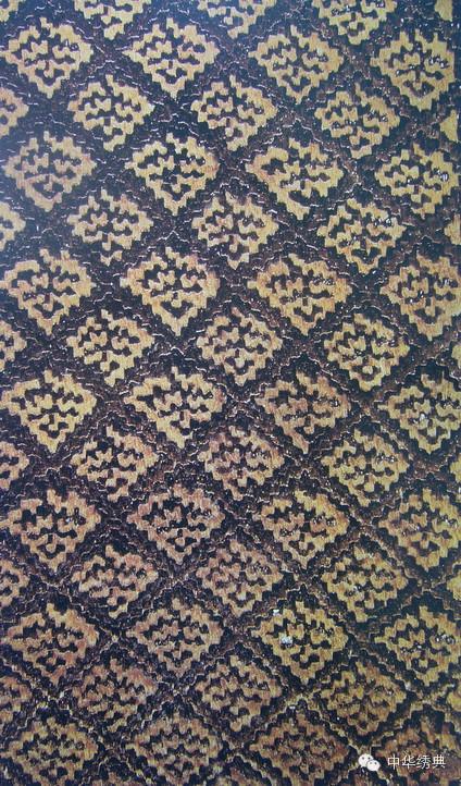 煙 色絹地樹紋鋪絨繡片,漢,1972年湖南省長沙馬王堆出土,紋樣長寬各4CM,現(xiàn)藏湖南省博物館。此繡為棺外裝飾,用朱紅、黑、煙三色絲線繡成,平直針鋪 就整個地料,排列均勻,針腳整齊。以形變的幾何菱紋為主體,內(nèi)填紅地?zé)熒y,形成四方連續(xù)的裝飾圖案,是早的平直針繡品。