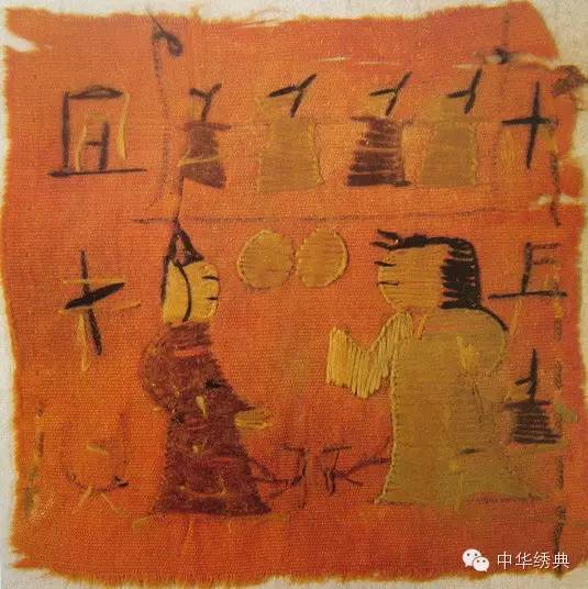 淺黃色絹刺繡人物圖, 東漢,1959年甘肅武威磨嘴子出土,長7.5CM,寬7.5CM,甘肅省博物館藏。較長線段在地料上簡單橫拉,容易磨損脫落,不如早期辮子繡裝飾性和耐 磨性,所以絲線脫落后可見勾勒的墨跡。其時刺繡作品少見反應(yīng)現(xiàn)實生活場景為題材,此繡稚拙成趣,針法既變用于表現(xiàn)人物及場景,但直針繡明顯還未發(fā)展成熟。 此作可視作直針在圖案類繡品中的較早嘗試,殊為珍貴。