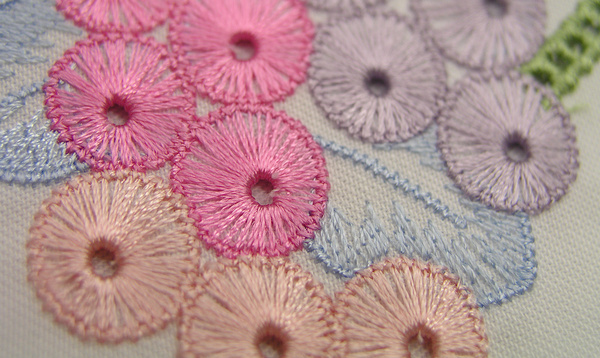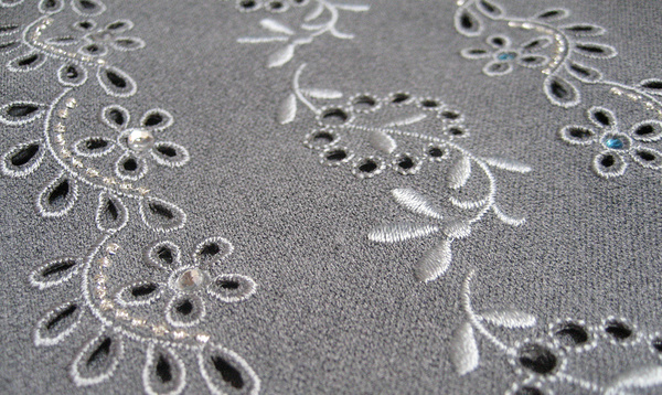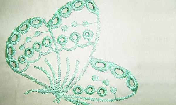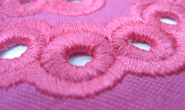 電腦繡花雕孔繡,又稱鏤空繡、打孔繡,是借助電腦繡花機上安裝的雕孔刀或雕孔針等工具,在刺繡面料上進行打孔后進行包邊刺繡的繡花加工工藝,雕孔繡是一種對繡花制版及繡花設備有著較高要求,但繡花展現效果十分精美的現代繡法。
