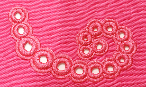 雕孔繡的打法有兩種:如果雕孔針是老式的,不跟繡花針齊平,打版時就需要偏移一下,偏移6cm左右;如果雕孔針是直接安裝在繡花針那個位置,就跟平時打法差不多,即先用一個顏色畫一個小圓圈,然后再用另一個顏色打一個大圓圈,繡的時候先用第一個顏色用雕孔針繡,這樣就會把布繡爛,然后再用平時繡花的那個繡花針去繡大圓圈,這樣就會繡出孔來。