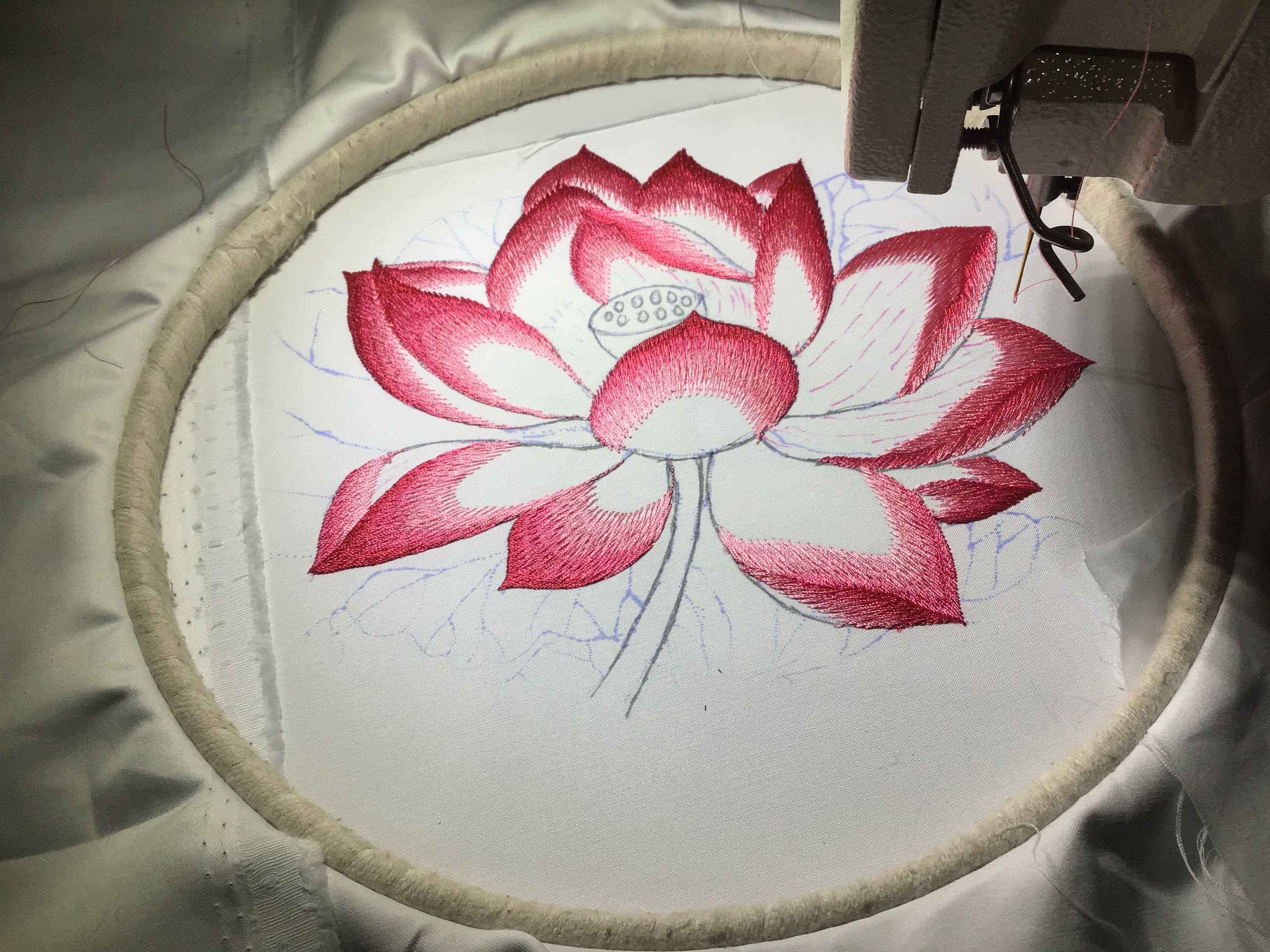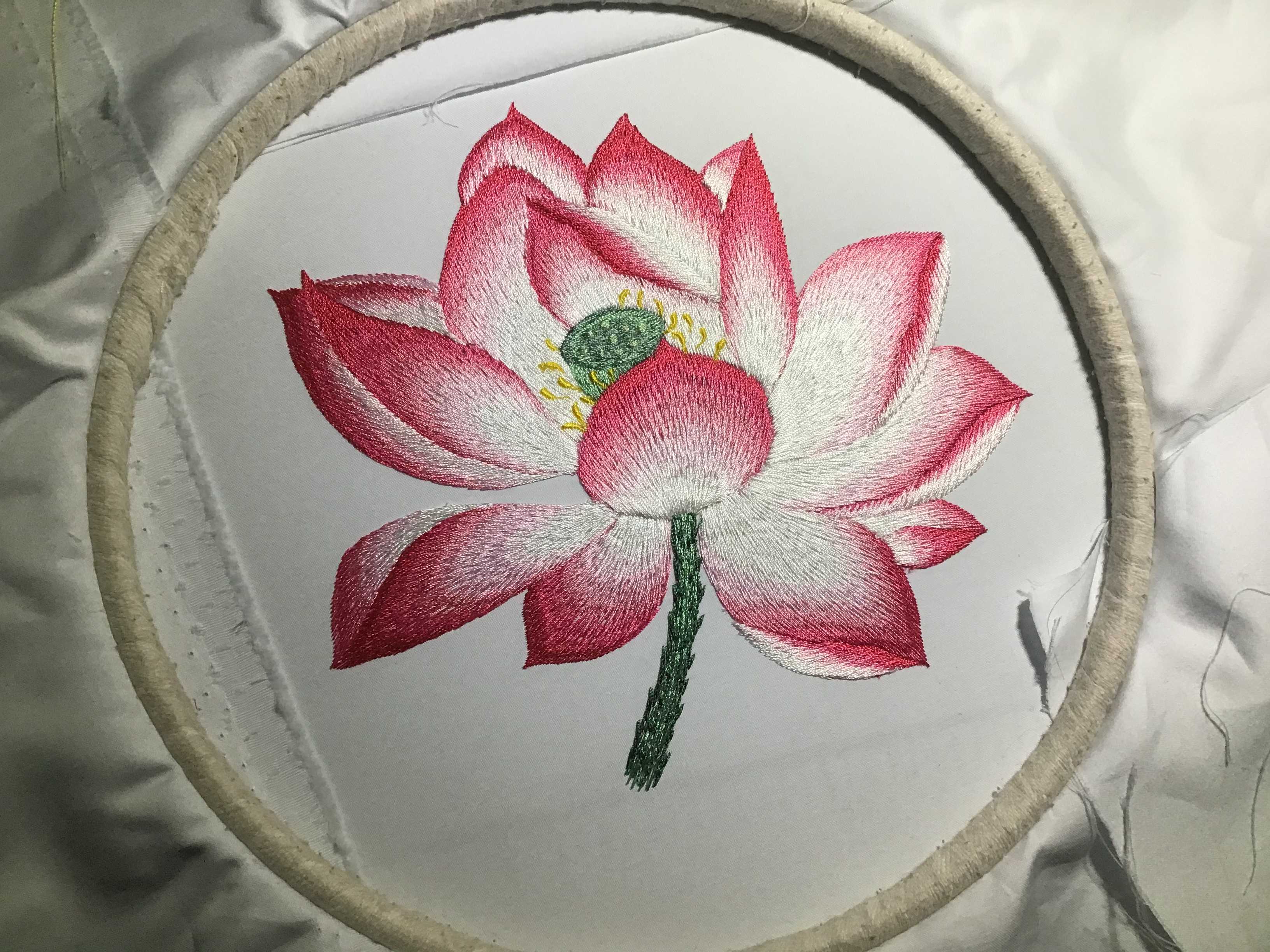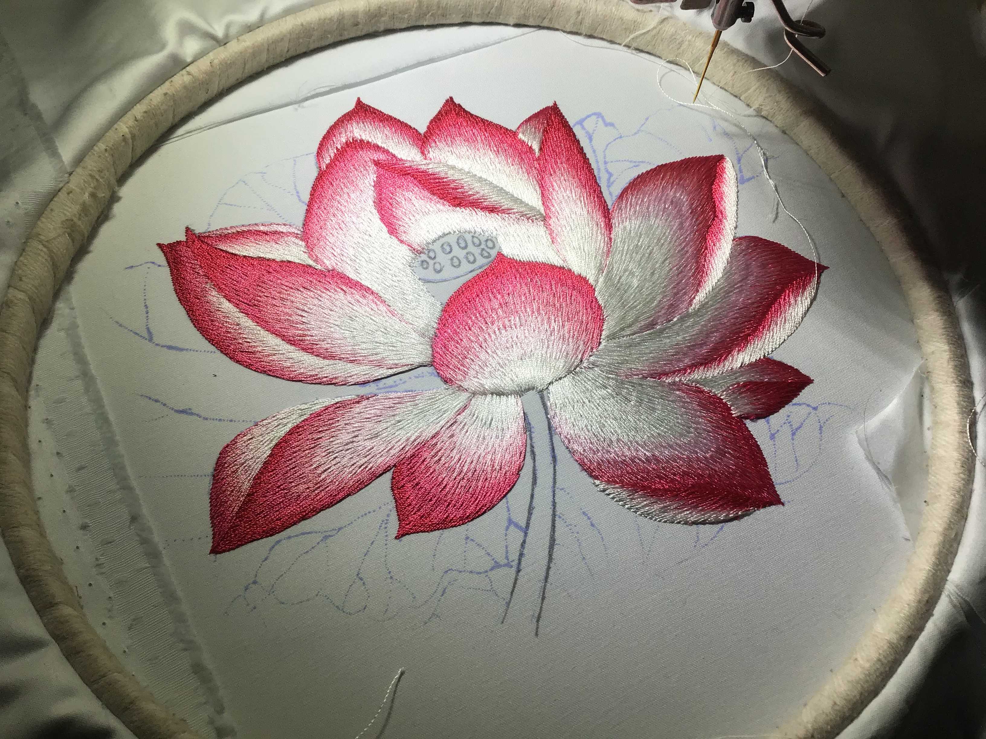 繡上花蕊和蓮蓬,一幅荷花就繡完了