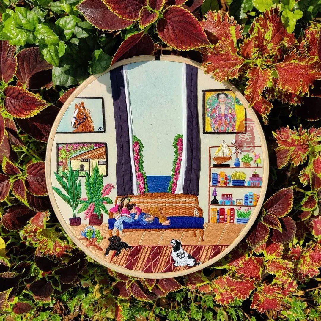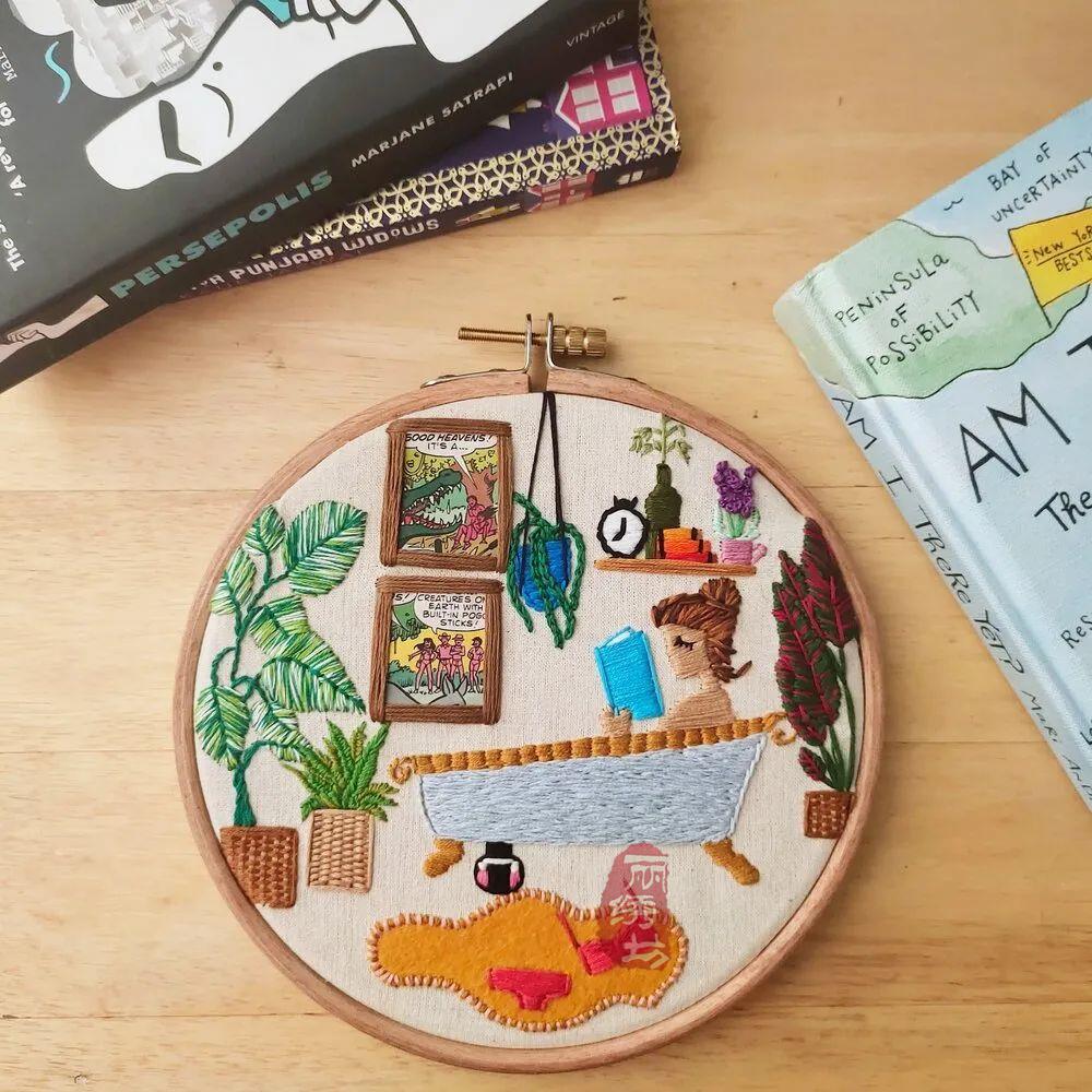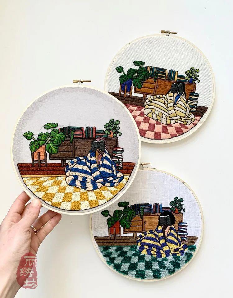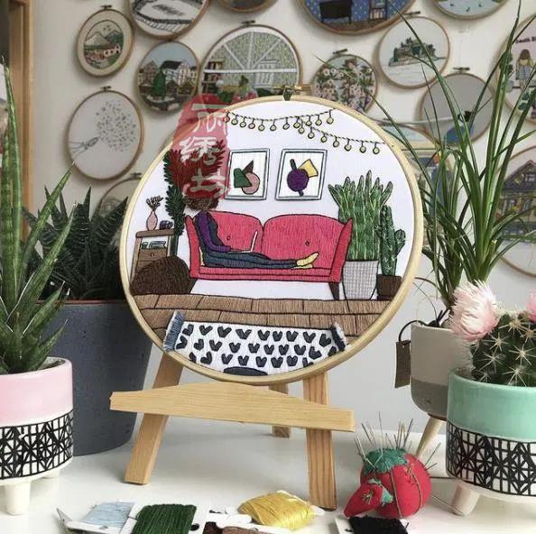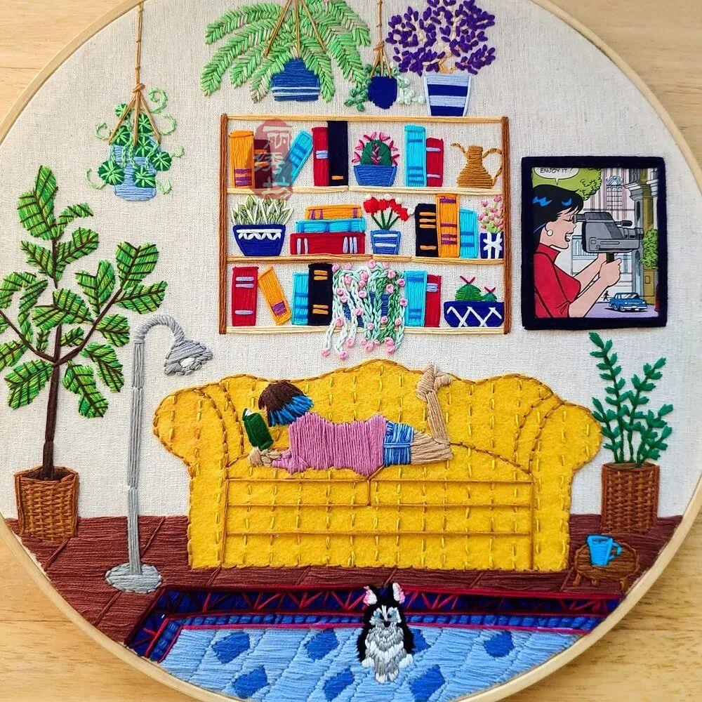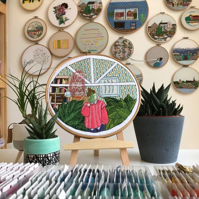 她用一針一圈的繡出細膩精致的居家氛圍,和戶外花園時光。讓受眾在看到這些作品時,意識到淡極始覺甜,即便獨自宅在家中,也能從單調的日常中提煉愜意悠閑的時光。