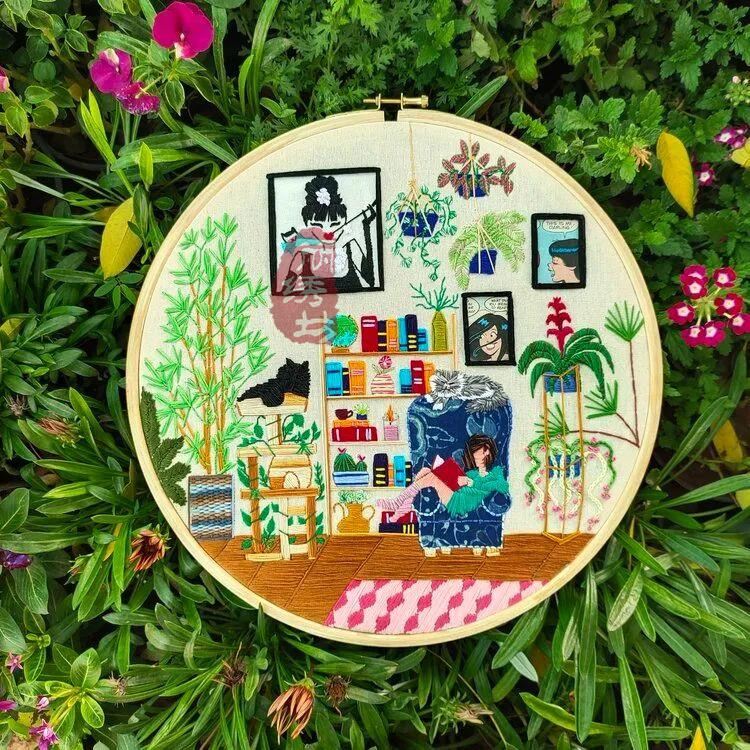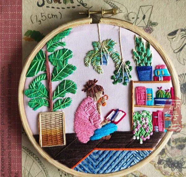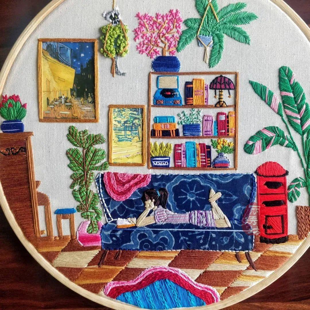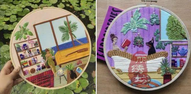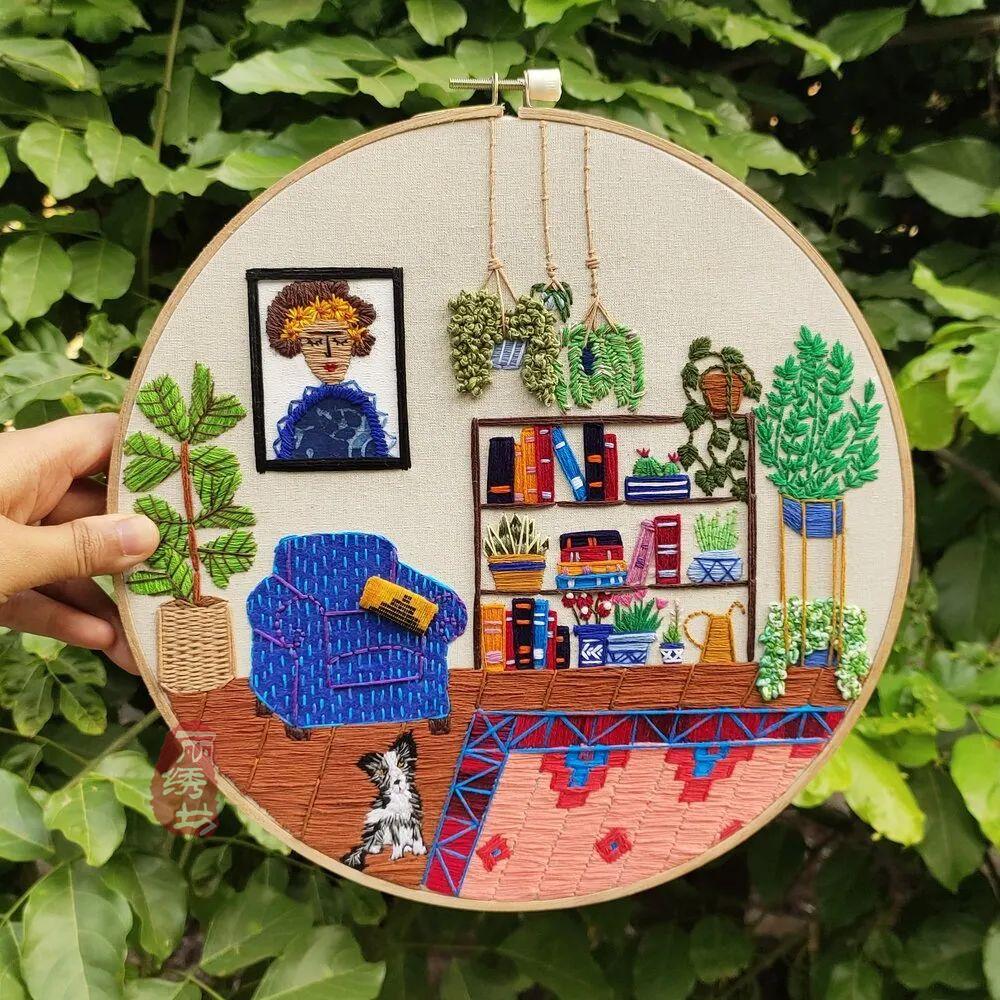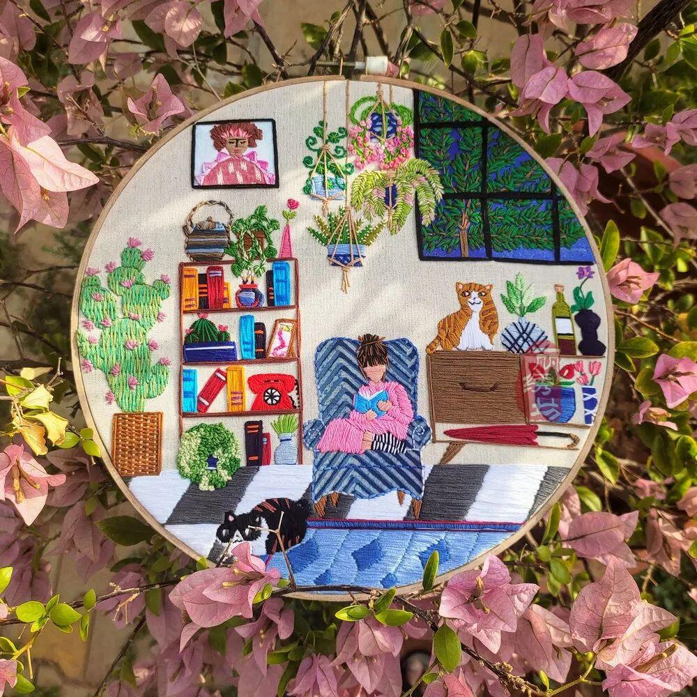 她用一針一圈的繡出細膩精致的居家氛圍,和戶外花園時光。讓受眾在看到這些作品時,意識到淡極始覺甜,即便獨自宅在家中,也能從單調的日常中提煉愜意悠閑的時光。