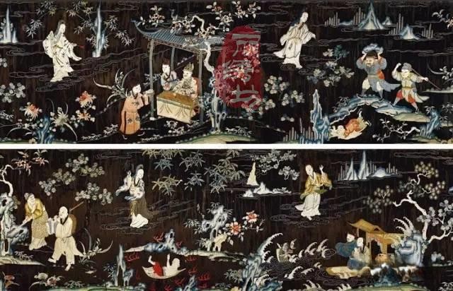 清 黑地刺繡庭院人物圖長幅橫披