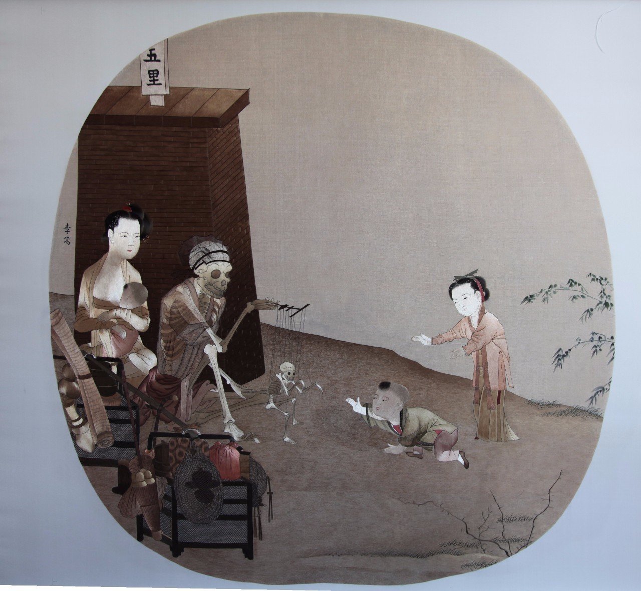 畫中一具骷髏人操縱著一個小的骷髏,如同進行木偶表演,右側(cè)孩童受此吸引正往小骷髏處爬,孩童身后的婦女似要阻攔,而骷髏人身后在哺乳的婦女則看著在爬的孩童。