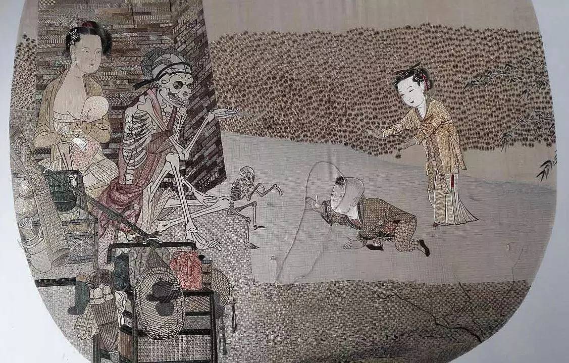 一直以來,很多人試圖對這幅畫進行解讀,說法不一。前段時間,這幅作品又一次密集的出現(xiàn)在大眾面前,因為,刺繡版的《骷髏幻戲圖》在威尼斯雙年展的中國館進行展示。