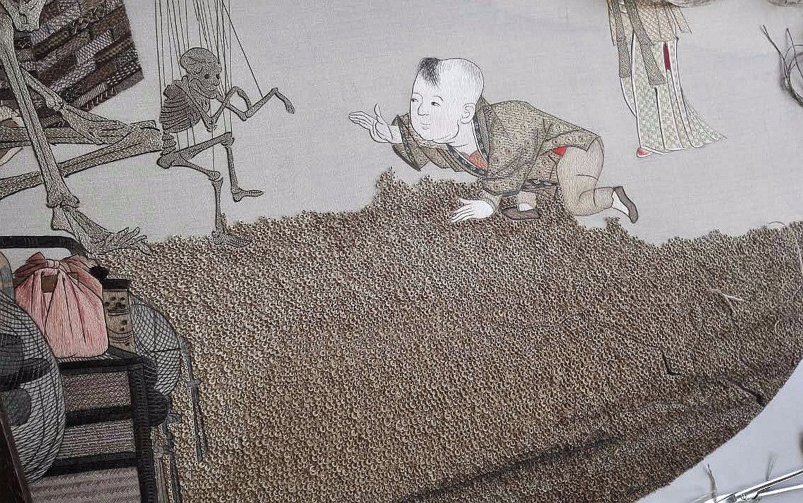 此次在威尼斯雙年展展示的刺繡《骷髏幻戲圖》共有8幅,每一幅雖然遠看畫面相同,但實際上每一幅的局部與細節(jié)所用的針法都是不一樣的,而且每一幅都用了50多種傳統(tǒng)針法去繡制,充分展現(xiàn)了當代刺繡藝術(shù)的豐富性和藝術(shù)性。