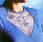 用細(xì)的機(jī)針和機(jī)繡線在蕾絲面料上車(chē)縫,也可以用真絲或人造絲線,在繡花針跡中增加一些光澤,在設(shè)計(jì)圖樣上車(chē)縫幾次,使繡的圖案更鮮明。