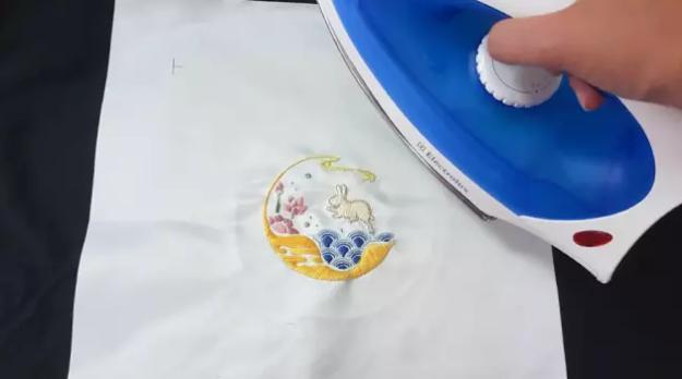 繡好的繡布拆下,用熨斗燙平皺褶。(注意不要碰到繡線部分!)