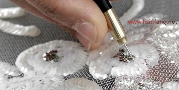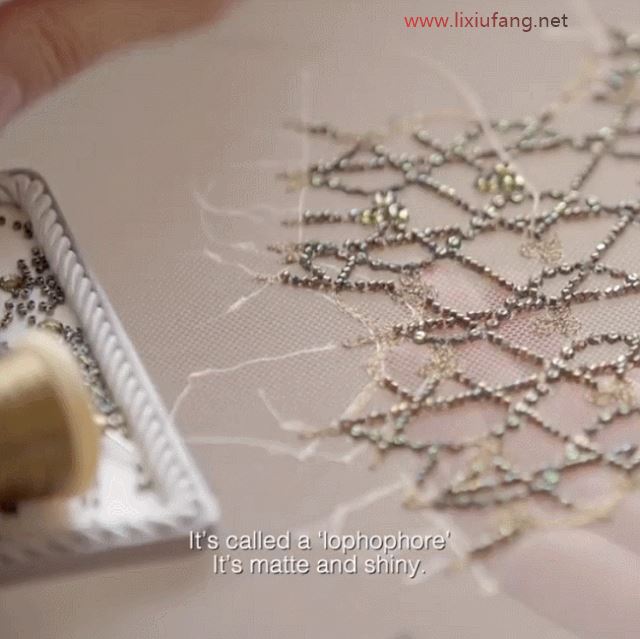 法式刺繡的操作方法,是用一種名叫「 Lunéville 」的獨特鉤針進行隱性的反面刺繡工藝,為了保持雙面的平整細致,刺繡時,面料正面朝下,只能靠手去感受珠子和亮片,蠻考驗人的空間感應能力的。