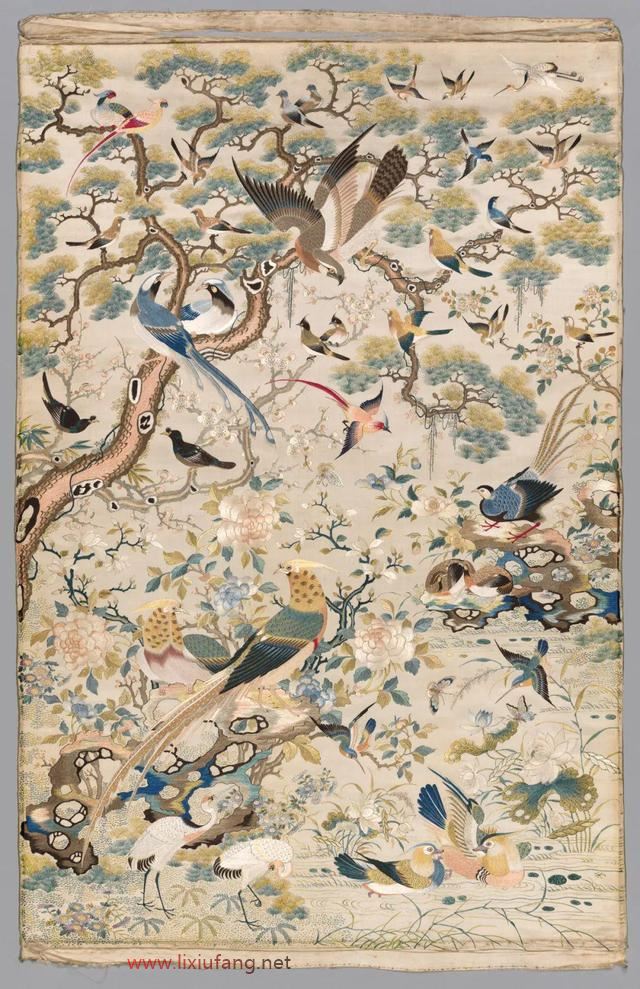 中式刺繡在構圖時吸收了很多中國畫的元素,既有寫實的花鳥魚蟲,也有寫意的湖光山色。