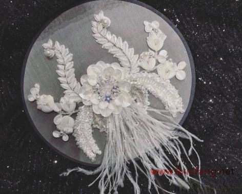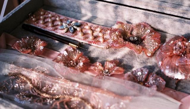 而法式刺繡注重用各種材料構(gòu)造出立體感,像是絲帶或者是寶石,都能成為法式刺繡中的材料。如果說中式刺繡是一幅畫的話,那么法式刺繡就像是雕塑。在法式刺繡中常出現(xiàn)的就是藤蔓和花朵,法式刺繡在表現(xiàn)花朵的時候更多的是先裁剪出花瓣或者制作出繡片,然后縫在衣服上,這樣花朵就突出在平面之上,有一種很逼真的立體感。