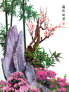 在傳統(tǒng)繪畫(huà)形式中,把梅、竹合畫(huà)一幅之上稱為“梅竹雙清”,無(wú)論詩(shī)歌還是繪畫(huà),都是將梅、竹分而吟詠圖繪的。梅的特質(zhì)是在嚴(yán)寒中傲雪綻放;竹的特質(zhì)是四季常青、凌云深處仍虛心!梅竹合在一起暗喻一個(gè)人堅(jiān)持自己的信念、實(shí)力、再?gòu)?qiáng)仍虛心的高尚人格。!